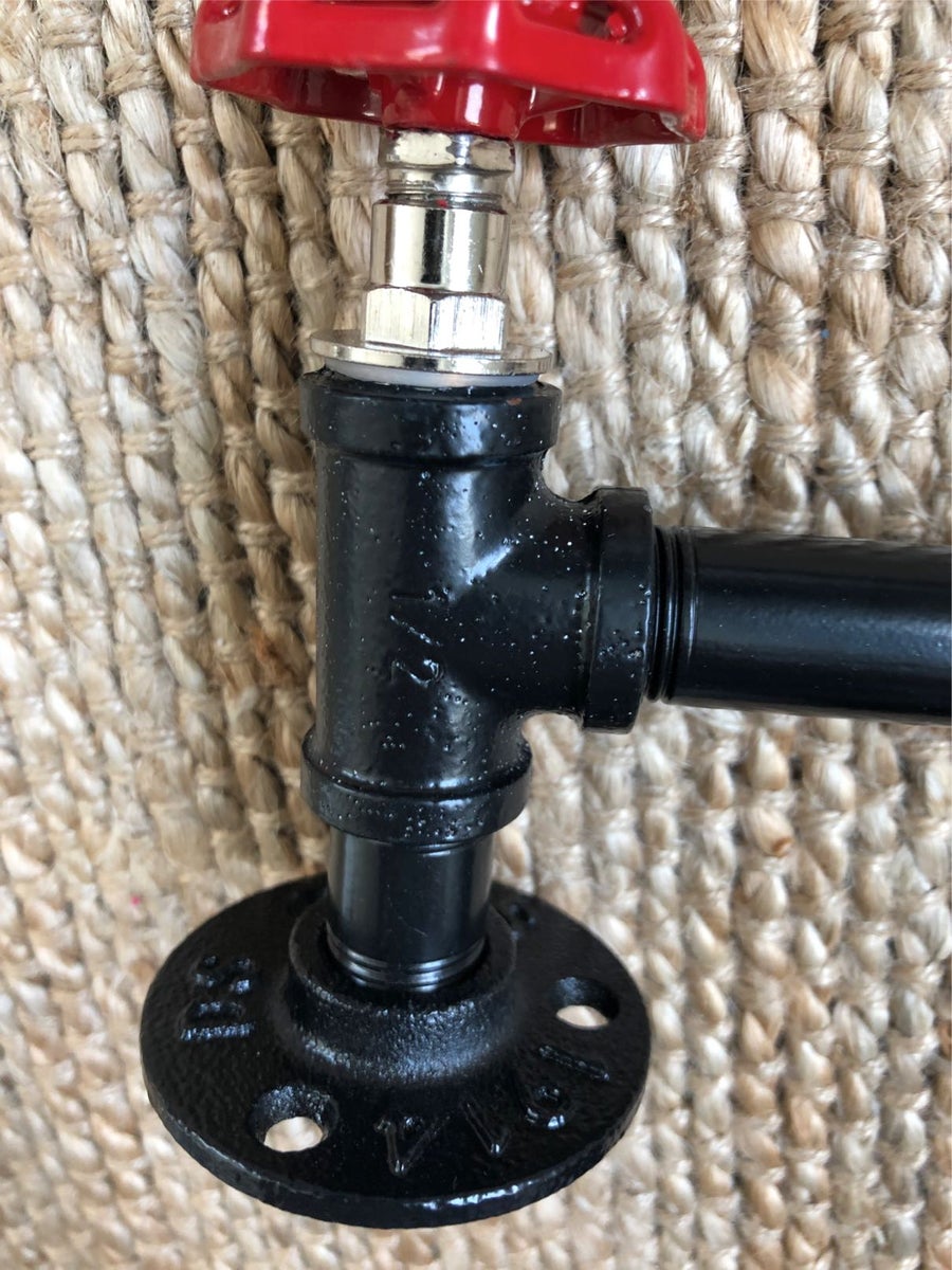 Tillverkad av ett riktigt metallvattenrör och försedd med en avstängningskran som ger karaktär.